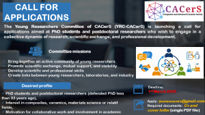 Le Comité scientifique des jeunes chercheurs du CACerS se veut une structure inclusive et dynamique destinée à rassembler des doctorants engagés ainsi que des chercheurs récemment diplômés, ayant soutenu leur thèse depuis moins de trois ans, tout en veillant à une représentation équilibrée entre les genres. Son ambition première est de fédérer une nouvelle génération de scientifiques autour d’un réseau vivant favorisant le partage de connaissances, la solidarité académique et la mise en valeur des travaux de recherche. À travers ses actions, le comité vise également à accompagner ses membres dans l’acquisition de savoir-faire transversaux et à renforcer les passerelles entre le monde académique, les laboratoires et les secteurs industriels.